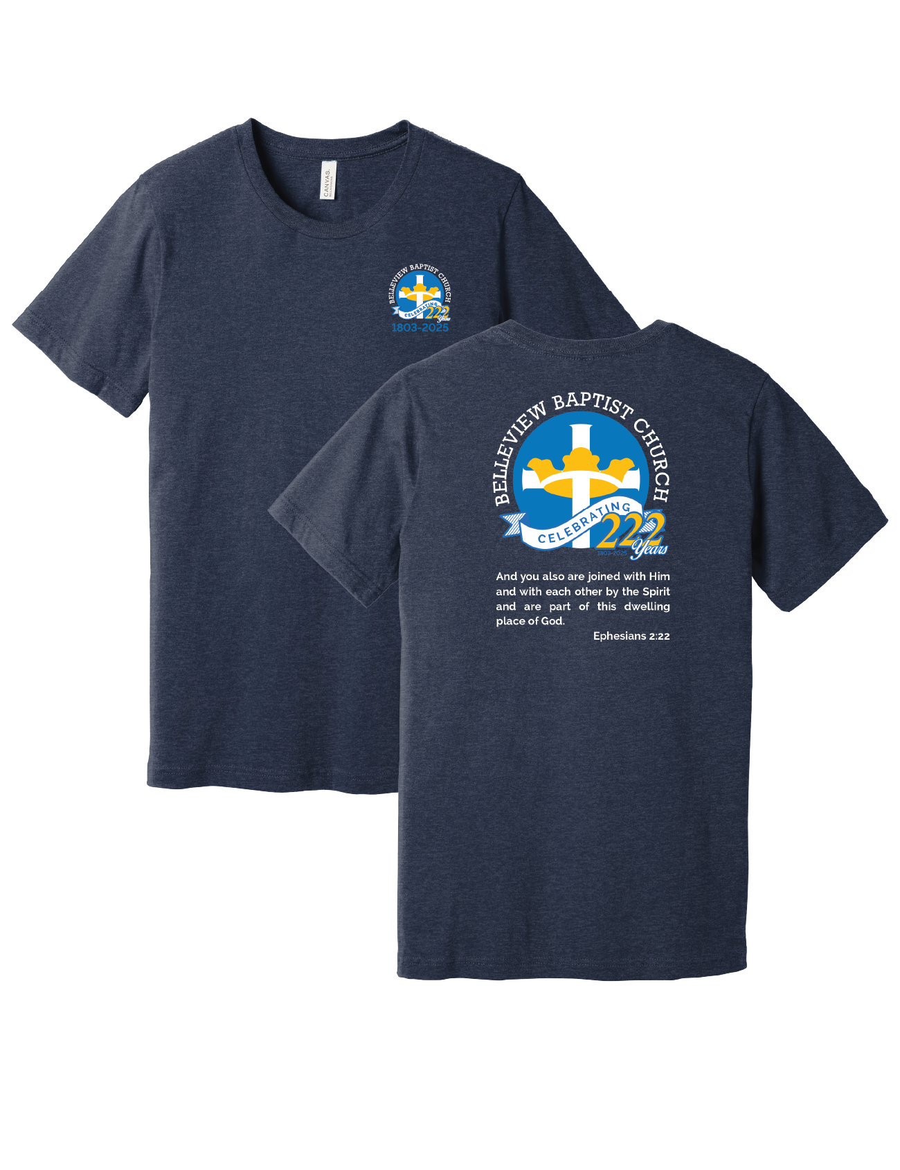 Adult shirt available in sizes S-4XL. This extremely soft and comfortable T-Shirt from Bella + Canvas is available in Heather Midnight Navy. The “222” logo celebrating Belleview Baptist Church’s 22nd year of Serving the Lord is found on the front left chest as well as on the back in large size. Beneath the logo on the back is quoted Ephesians 2:22. It reads, “And you also are joined with Him and with each other by the Spirit and are part of this dwelling place of God.”